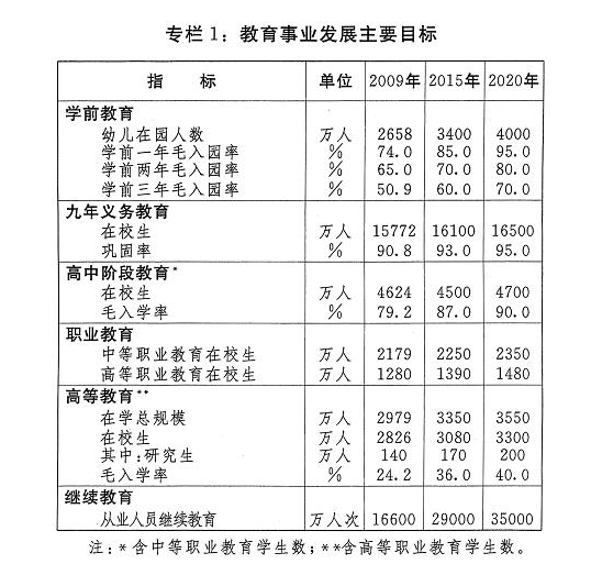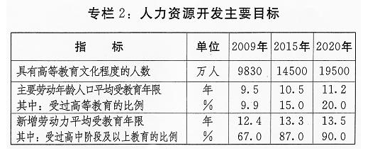 实现更高水平的普及教育。基本普及学前教育;巩固提高九年义务教育水平;普及高中阶段教育,毛入学率达到90%;高等教育大众化水平进一步提高,毛入学率达到40%;扫除青壮年文盲。新增劳动力平均受教育年限从12.4年提高到13.5年;主要劳动年龄人口平均受教育年限从9.5年提高到11.2年,其中受过高等教育的比例达到20%,具有高等教育文化程度的人数比2009年翻一番。