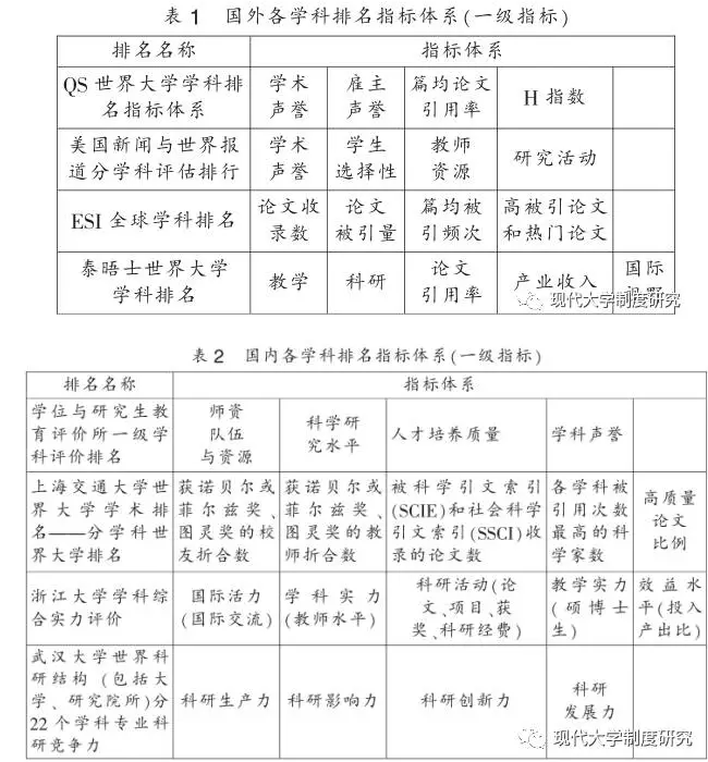 当前,国内学科评价的主要形式是排名,拥有较大影响的有武汉大学中国科学评价研究中心《世界一 流大学与科研机构学科竞争力评价》、上海交通大学高等教育研究所 《世界大学学术排名———分学科世界大学排名》、广东管理科学研究院 《中国大学学科及专业等级排行榜》、浙江大学《大学评价和学科评价研究》以及学位与研究生教育评价所《一级学科评价排名》等,各排名分别采用各具特色的指标体系对学科进行评价并排序。