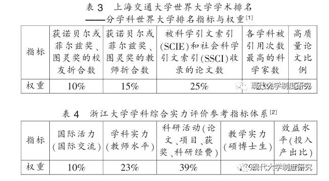 为什么学科排名能够迅速地在国内落地开花并引起高校、社会的广泛关注?其一是作为比较型评价,学科排名的结果简单明了,直接展示了学科之间的相对水平,既有利于高校和学科了解自身与同类学科之间的差距,确立标杆,并采取相应的策略进行赶超,又能够作为政府进行资源投入的依据;三是能够作为社会认识学科的窗口并将其作为择校的依据,以上三方面对提高学科水平都有一定的激励作用。其二是当前排名所采用的指标相对而言容易量化, 便于计算,特别是科研产出的客观数据容易获得,也易于统计。 我们发现,国内的学科排名中属于科研产出类的指标占有相当的比重。上海交通大学世界大学分学科排名主要考察学科的科研表现,其中论文数量、高质量论文比例两项指标占 50%的权重, 浙江大学学科综合实力评价中科研活动指标的权重达 39%。 (见表 3、4)