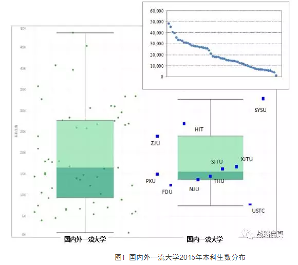 57所国内外一流大学的本科生数如图1与表2所示。图1中的箱线图以本科生数为纵坐标,左侧的箱体反映的是57所国内外一流大学的本科生数分散情况,右侧的箱体反映的是C10的本科生数分散情况。图1右上角的散点图反映的是57所国内外一流大学本科生数的分布。
