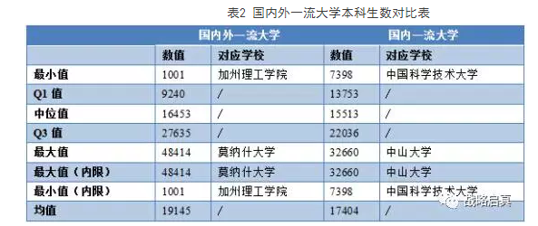 由表2可见,国内一流大学中本科生数的最大值约为国内外一流大学最大值的67%左右,国内一流大学本科生数的最小值却也达到了国内外一流大学最小值的7倍多,国内与国内外一流大学本科生数的均值较接近,国内一流大学的本科生数整体更为均衡。
