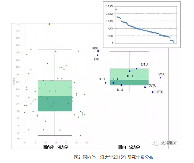 57所国内外一流大学的研究生数如图2与表4所示。图2中的箱线图以研究生数为纵坐标,左侧的箱体反映的是57所国内外一流大学的研究生数分散情况,右侧的箱体反映的是C10的研究生数分散情况。图3右上角的散点图反映了57所国内外一流大学研究生数的分布。橙色点标注的是超过上下限(上限="Q3+1.5IQR,下限=Q1-1.5IQR,IQR是指四分位数差interquartile" range)的异常值(大学),其余的蓝色点则为正常分布在上下两个异常值截断点之间的大学。