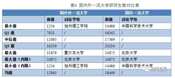 由表4可见,国内一流大学中研究生数的最大值约为国内外一流大学最大值的78%左右,国内一流大学研究生数的最小值却也达到了国内外一流大学最小值的11倍多,国内一流大学研究生数均值超过国外。国内一流大学的研究生数整体较国外更为均衡。