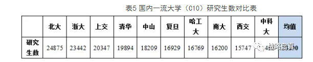 相对而言,C10的研究生数差异没有国外悬殊。大于均值的5个学校研究生数都大于19000人;10所大学中排名最末位的是中国科学技术大学,其数值为14486。C10大学中研究生数排名第一的是北京大学(24875),其次为浙江大学(23897)。可以看到,北京大学、浙江大学的研究生数在国内处于领先地位,即便从全球来看,也属于研究生规模较大的大学。