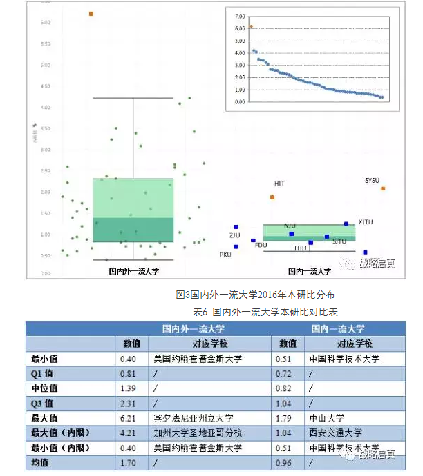 由表6可见,相对于国内外一流大学,国内一流大学的本研比整体偏低,国内一流大学的本研比最大值仅为国内外一流大学的本研比最大值的29%左右,但是最小值却相差不大。可以看出,国内一流大学非常注重研究生教育,而不少国内外一流大学则相对更注重本科生教育。