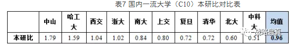 相对而言,C10的本研比差距较小,但存在两个异常值,中山大学(1.79)和哈尔滨工业大学(1.59)的本研比均高于上限值1.52,另外,还有西安交通大学和浙江大学的本研比也略高于1,其余6所大学的本研比均在0.5-1之间,分布相对集中。