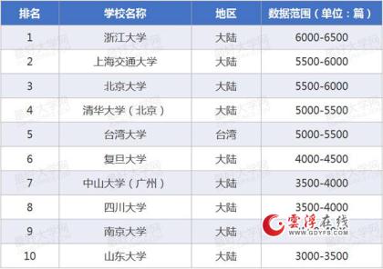 年度发表国际论文总量最多的前10所大学中有9所来自大陆,其中浙江大学发表的论文总量凌驾了6000篇。台湾大学排在第5名,是唯一进入前10名的非大陆高校。见表1。