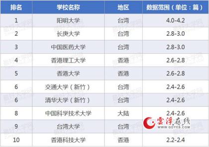与此形成鲜明对比的是,师均发表国际论文最多的前10所大学中仅有1所来自大陆,其他9所全部是港台高校,其中阳明大学的师均论文数量凌驾了4篇,稳居第一。见表2。