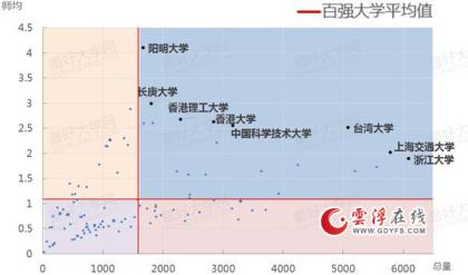图2显示,为数众多的大学集中在第三象限(“总量”和“师均”表现都低于整体平均值),第一象限(“总量”和“师均”表现都高于整体平均值)的数据跨度最大,其中除了阳明大学和浙江大学外,长庚大学、香港理工大学、香港大学、中国科学技术大学、台湾大学、上海交通大学的综合表现也很突出。