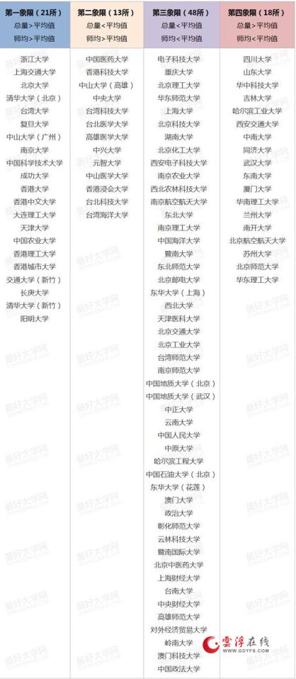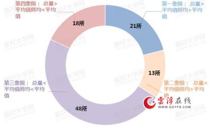 图3统计了上图四个象限的学校数量,可以看到两岸四地百强大学中,近半数的大学位于第三象限,即无论“总量”还是“师均”表现都低于整体平均值。另外,划分有18所和13所大学位于第四象限和第二象限,其中位于第四象限即“总量>平均值,师均<平均值”的全部是大陆高校。各象限的学校名单见表3。